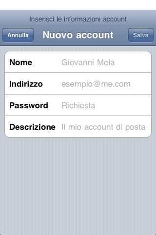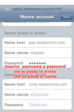 NOTA: Per questi account di posta l'impostazione è assistita dall'iPhone in quanto sono già prememorizzati i parametri utilizzati dal provider e devi inserire solo quelli legati alla identificazone della tua email: username e password.